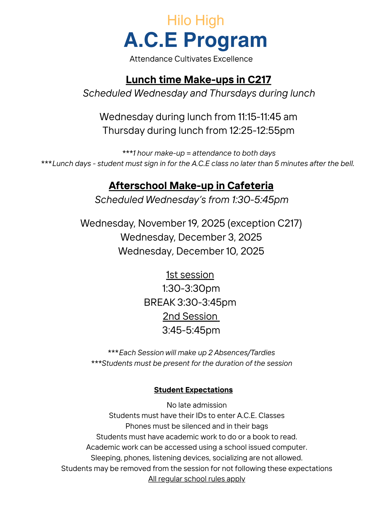 A.C.E. Program Schedule for November and December Attendance Cultivates Excellence. Attendance makeup schedule for November and December. Please see the attached flyer. Published November 19, 2025 Print