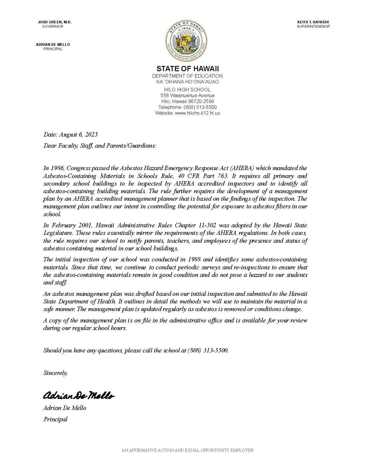 In February 2001, Hawaii Administrative Rules Chapter 11-502 was adopted by the Hawaii State Legislature. These rules essentially mirror the requirements of the AHERA regulations. In both cases, the rule requires our school to notify parents, teachers, and employees of the presence and status of asbestos containing material in our school buildings.