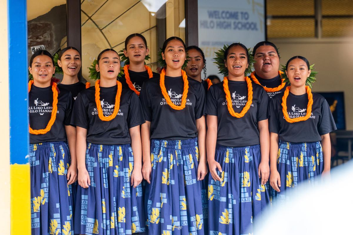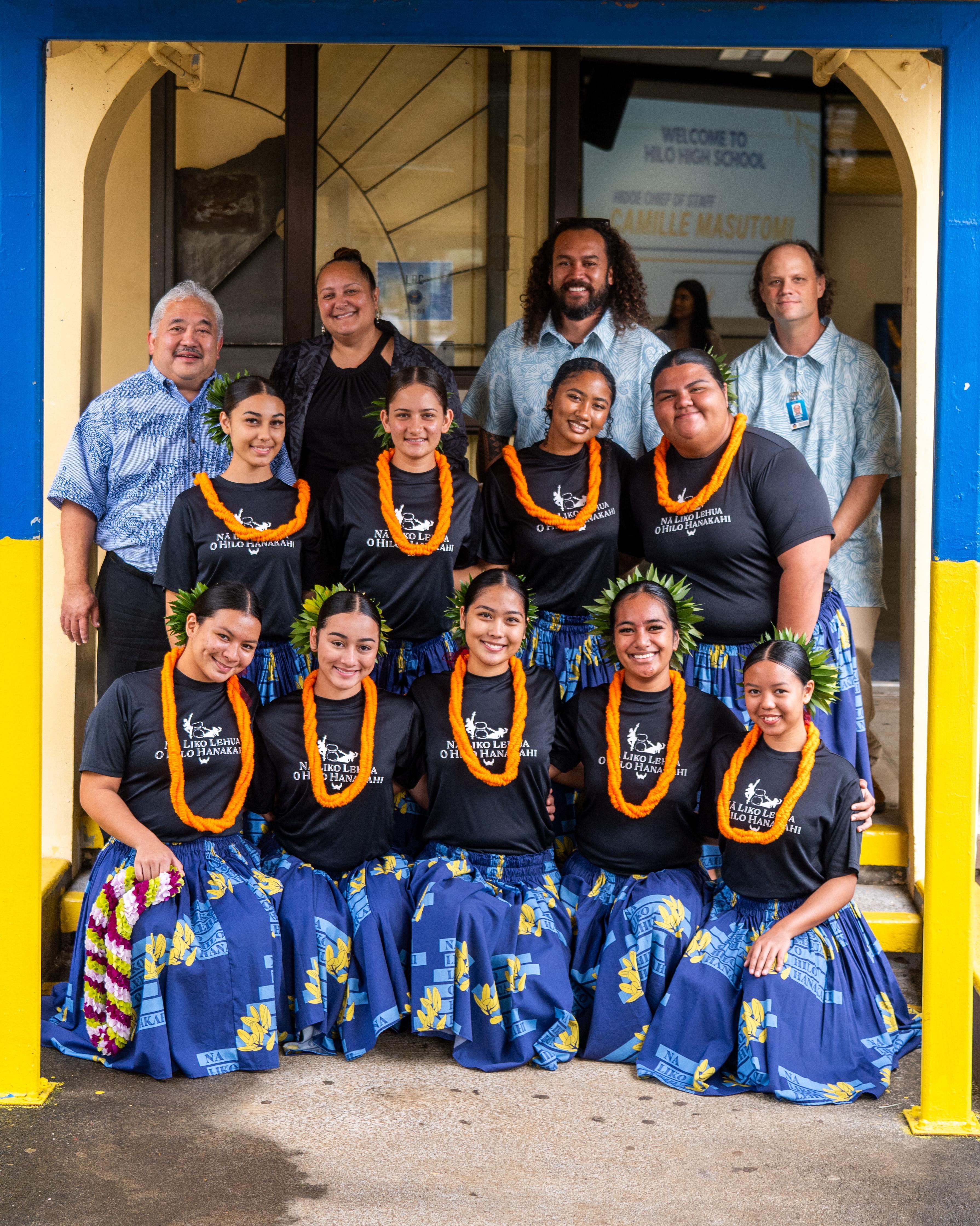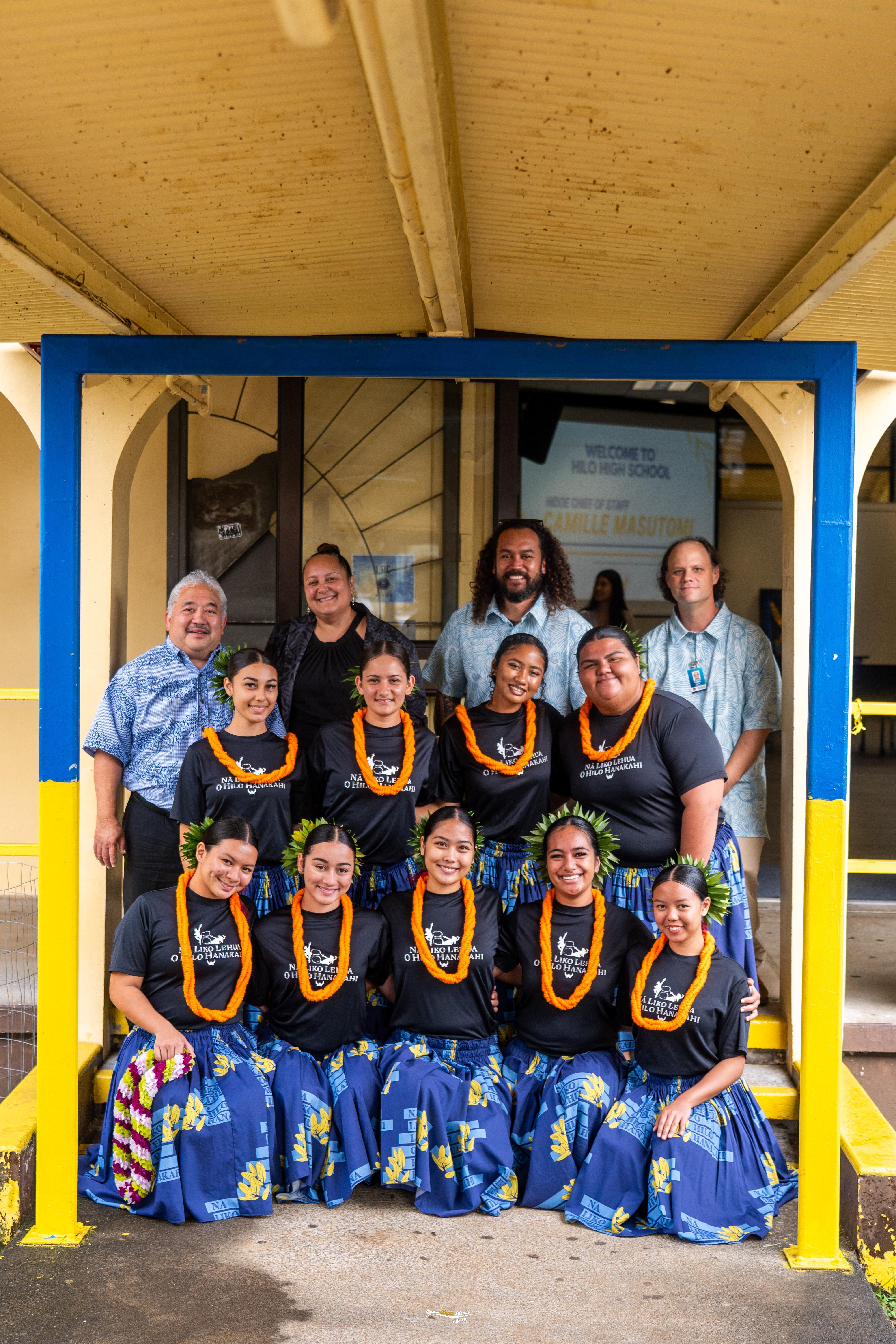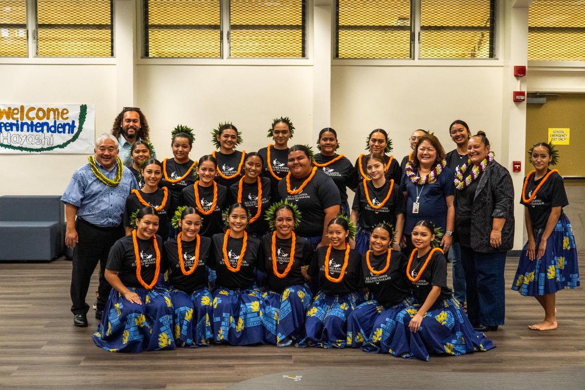 Starting his visit at Hilo High School, the Hawaiian Dance class, also known as Na Liko Lehua o Hilo Hanakahi greeted the visitors with a welcome 'oli and an 'auana performance. Superintendent Hayashi mentioned that it was a, "chicken skin" moment to be greeted in such a way.
