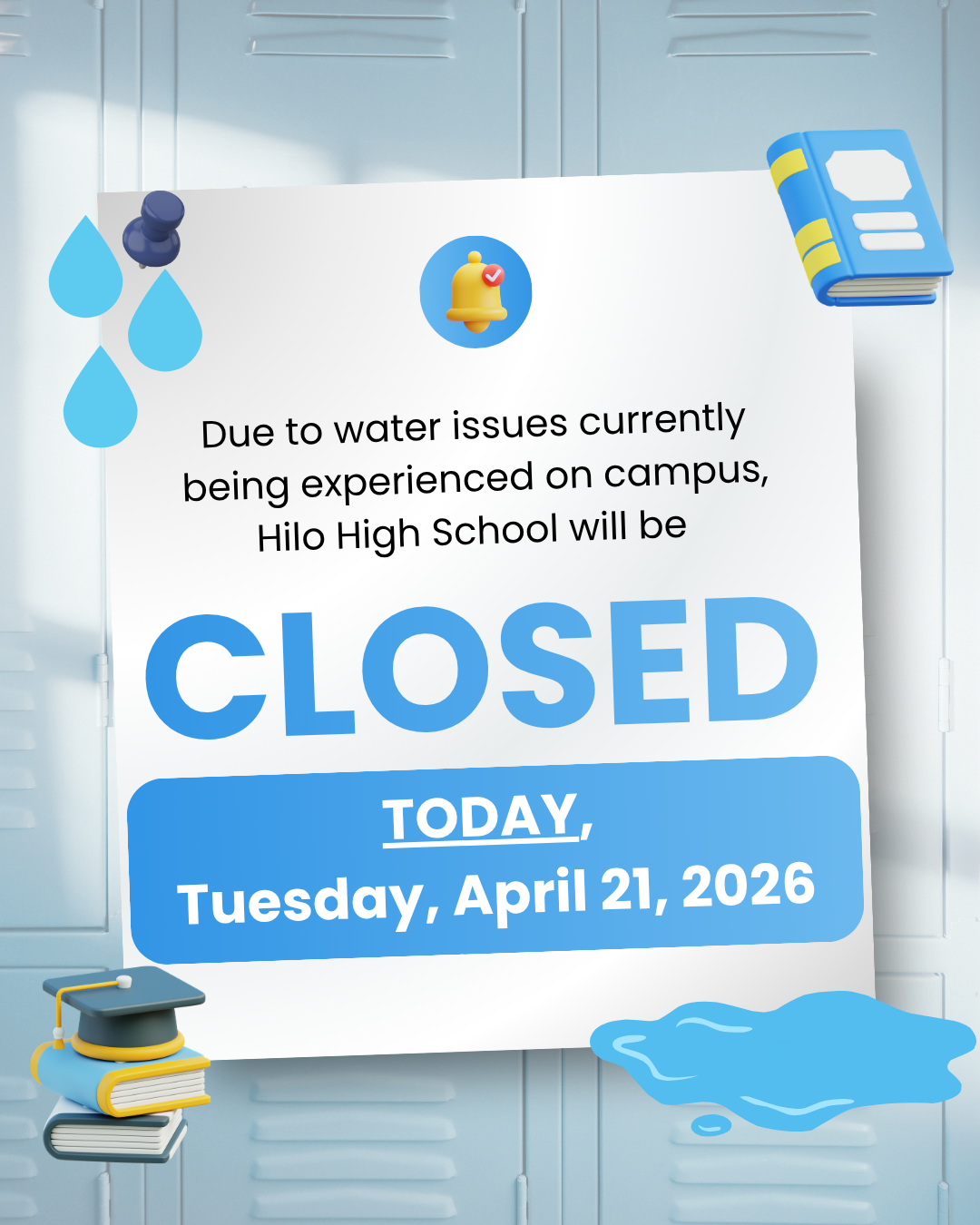 Due to water issues currently being experienced on campus, Hilo High School will be closed today out of an abundance of caution and to ensure the safety of our students and staff.